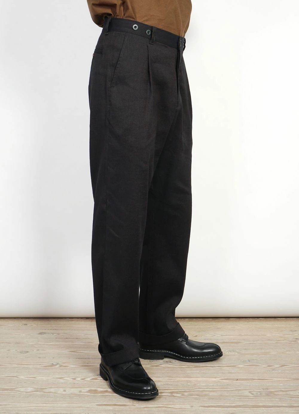 SUNE has wide cut legs, pleats and suspender buttons it refers to the past. It can be worn separately or as part of our well-known casual looking three-piece suits.