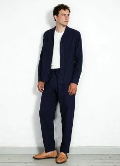 When getting closer to this sturdy Italian canvas, made from linen and cotton, the natural fibres dots comes to light. This characteristic happens due to the remains of the seeds from the flax plant. The garments come in an undyed and over-dyed version.