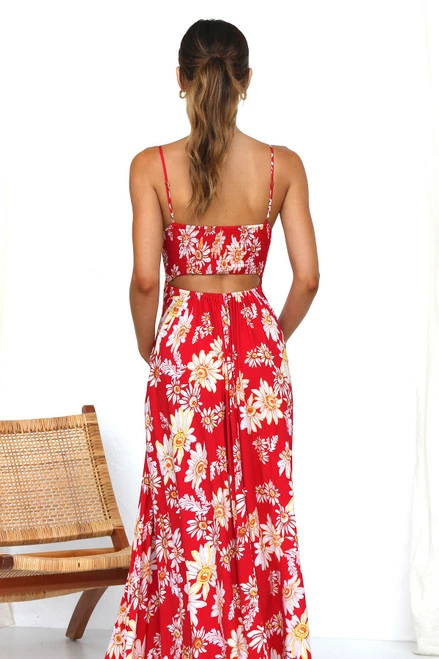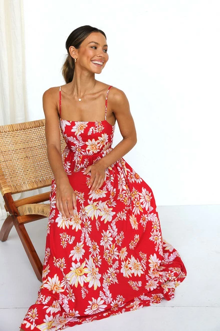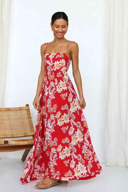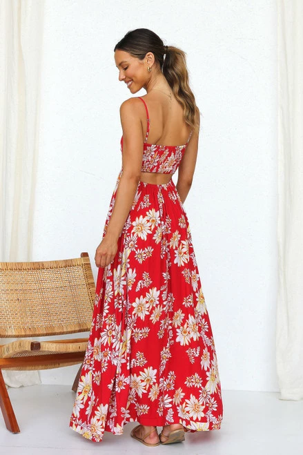 - red floral print maxi dress