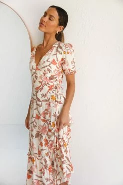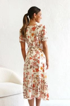 - floral print midi dress on beige base